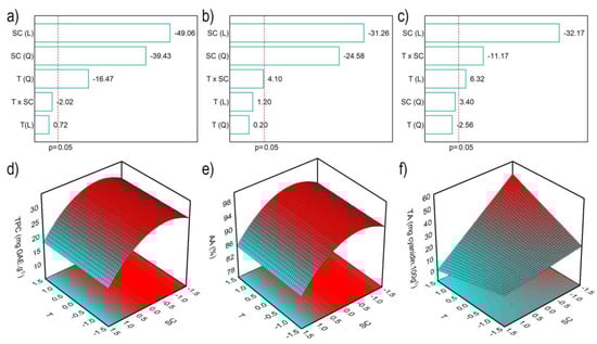 Pareto charts and the surface response of TPC (a,d), AA (b,e) and TA (c,f), respectively.