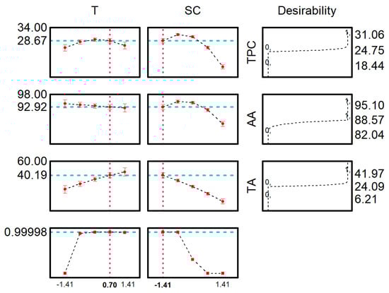 Pareto charts were employed to assess the effect of independent variables on the TPC, AA and TA (Figure 1a–c) with a significance of 95% (p < 0.05). In the TPC results, temperature (T) and solvent concentration (SC) showed significant negative effects. This result suggests that lower temperatures and ethanol concentration favor the TPC. For the AA and TA contents, the solvent concentration was the most influential effect.