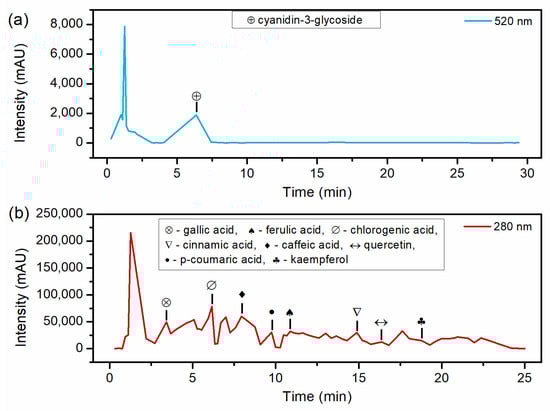 HPLC chromatograms of optimized araçá extract (a) at 520 nm indicating retention time of anthocyanins and (b) at 280 nm indicating retention time of phenolic acids and flavonoids.