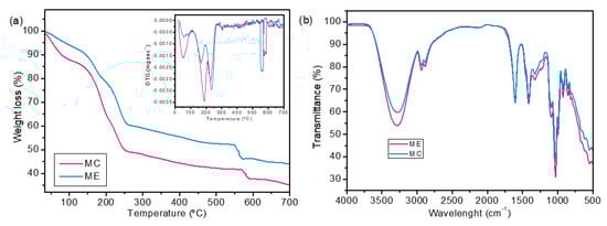 Characterizations of MC and ME membranes. Thermogravimetric curves (a), FTIR spectrum (b).