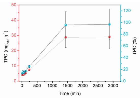 To verify the release of phytochemicals in the membrane, a solution was used to simulate the exudate of skin wounds (142 mmol.L of Na and 2.5 mmol.L of Ca), using NaCl and CaCl2 for its preparation. The membranes were cut into 2 × 2 cm and immersed in the solution, remaining under constant stirring at a temperature of 37 °C for times between 15 min and 24 h. Afterward, aliquots were removed, and the TPC was analyzed to verify the release of phytochemicals in the medium.