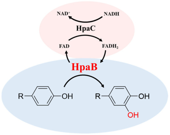 4HPA3H is a two-component system comprising HpaB (monooxygenase) and HpaC (FAD oxidoreductase) that was initially identified as the first enzymatic step for 4HPA degradation in E. coli [22,34]. HpaB is the large component, ranging in size from 39 to 63 KDa, and has been characterized as an FADH2-utilizing monooxygenase. HpaC is the small component, with a molecular weight of 16–22 KDa, and is an NAD(P)H-flavin oxidoreductase that couples factors and supplies FADH2 to HpaB by consuming NAD(P)H. Therefore, the 4HPA3H-initiated reaction (Figure 2) requires the supply of NAD(P)H to regenerate coenzyme FADH2 [22,30,35].