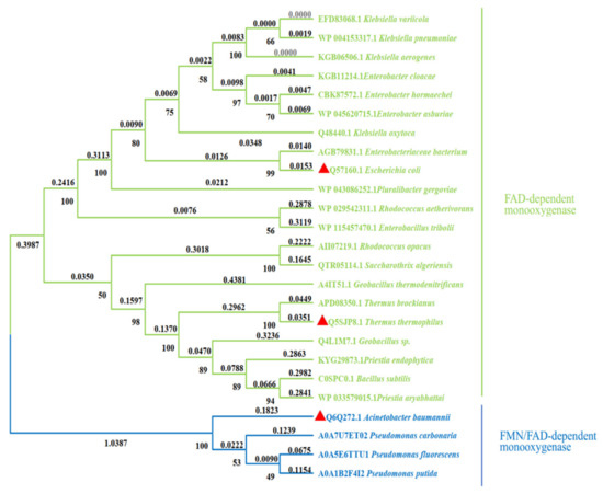 Phylogenetic tree of different HpaB sources. The red triangle represents the HpaB whose crystal structure has been resolved. (Phylogenetic tree was constructed by using MEGAX based on the neighbor-joining algorithm [48]).
