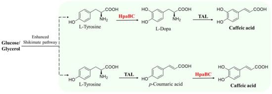 After identifying that native EcHpaB exhibited moderate activity toward both p-coumaric acid and tyrosine, Lin et al. established the first artificial pathway in the E. coli strain for the de novo production of caffeic acid via the overexpression of EcHpaB, EcHpaC, and Rhodobacter capsulatus tyrosine ammonia-lyases (TALs) (Figure 7). The engineered E. coli strain could produce 12.1 mg·L−1 of caffeic acid from the carbon sources containing 10.0 g·L−1 glycerol and 2.5 g·L−1 of glucose in shake flasks after 48 h culture [55]. They further increased the caffeic acid titer in shake flasks (50.2 mg·L−1) by alleviating feedback inhibition and redirecting the carbon flux into tyrosine biosynthesis [55]. Moroever, they engineered a phenylalanine over-producer into a tyrosine over-producer and introduced their developed caffeic acid artificial pathway. After adjusting the expression strategy and optimizing the inoculant timing, the de novo production of caffeic acid from the engineered E. coli strain could attain 766.7 mg·L−1 in shake flasks after 72 h cultivation [16]. Liu et al. recruited HpaB and HpaC from several bacteria and constructed an artificial caffeic acid pathway similar to that in the Lin et al. study [55] (that is, overexpression of HpaB, HpaC, and TALs) in Saccharomyces cerevisiae. The highest production of caffeic acid from the engineered yeast was obtained with the enzyme combination of HpaB from P. aeruginosa and HpaC from Salmonella enterica, which yielded 289.4 mg·L−1 caffeic acid in shake flask cultivation. They also found that appropriate cooperation between HpaB and HpaC from different bacteria was extremely important in driving product synthesis from endogenous metabolic resources [56].