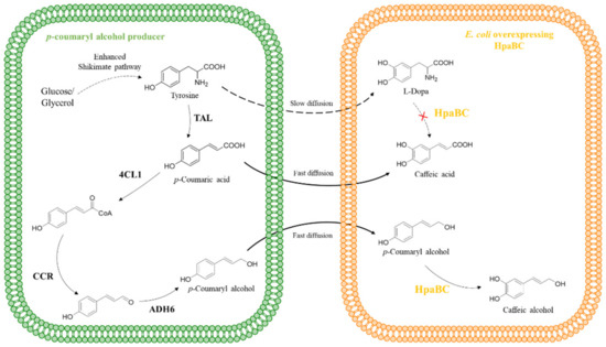 Based on the successful construction of a biosynthetic pathway of p-coumaryl alcohol, Chen et al. [57] further extended the pathway to produce caffeic alcohol (Figure 8). The promiscuity of HpaB results in the formation of an unstable intermediate, L-dopa, from tyrosine, causing the loss of carbon sources during fermentation. To solve this problem, they adopted microbial cocultures of p-coumaryl alcohol producers and E. coli overexpressing HpaB and HpaC to minimize the accessibility of HpaB to tyrosine. They chose this strategy because the E. coli cell membrane has a lower diffusion resistance toward p-coumaryl alcohol compared to that of tyrosine. With the optimal inoculation ratio, 401.0 mg·L−1 of caffeic alcohol was produced. It is nearly 12 times higher than monoculture stain which was the p-coumaryl alcohol producer overexpressing HpaB and HpaC.