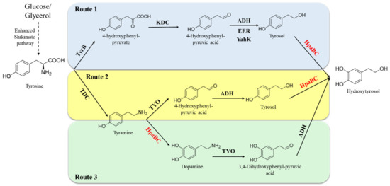 HpaB-involved synthetic molecular pathways for hydroxytyrosol. Route 1 (blue), Route 2 (yellow), and Route 3 (green). TyrB, aromatic-amino-acid aminotransferase; KDC, ketoacid decarboxylase; ADH, alcohol dehydrogenase; EER, endogenous E. coli reductase; YahK, aldehyde reductase; TDC; tyrosine decarboxylase; TYO, tyramine oxidase.