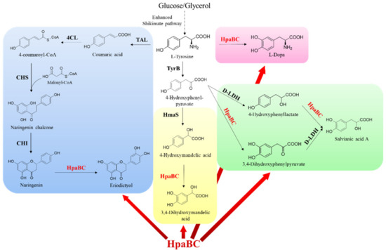 HpaB was widely used as a component in synthetic metabolic pathways to synthesize specific catechols from inexpensive and simple carbon sources, such as glucose and L-tyrosine. Given that L-tyrosine is the critical metabolite in the synthesis of phenols, the direct precursors of catechols, improving endogenous L-tyrosine synthesis and supplementing the media with exogenous L-tyrosine, were the most popular of those used to improve the production of catechol-containing compounds in related studies.