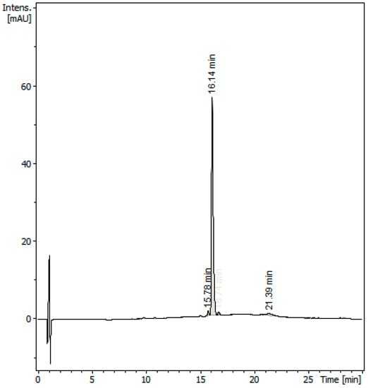 To get the best separation efficiency, different HPLC columns, compositions and elution time of the mobile phase, and column temperatures were tested and compared. Under optimized HPLC conditions (see Section 3.4), the chromatogram of the purified sample (Figure 2) showed a major peak, eluted with a retention time of 16.14 min, due to carnosol, which was flanked by two minor peaks, with a retention time of 15.78 min and 16.74 min, respectively. The first minor peak was tentatively identified as rosmarinic acid from the [M + H]+ ion at m/z 361, while the other peak was unidentified. The peaks in the chromatogram were highly symmetric and base-separated. Moreover, the duration of the analysis was reasonable.