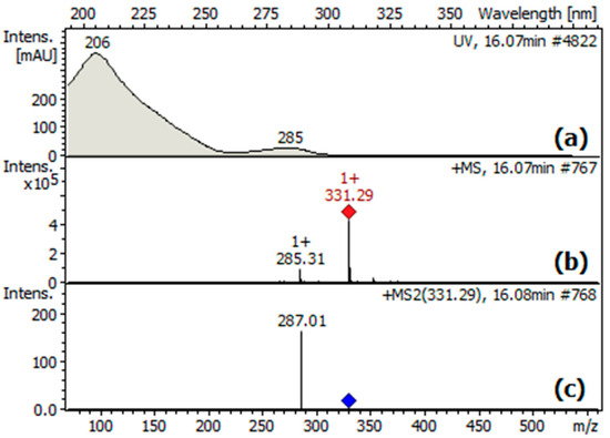 The identity of the major peak in the chromatogram as carnosol (1) was confirmed by the UV absorption spectrum (Figure 3a), which showed two characteristic bands with maximum absorbances at about 210 and 285 nm. Moreover, the UV spectra taken at the peak upslope and downslope, normalized, and compared, were identical, indicating that the peak was spectrally pure or that the peak corresponded to a single compound. On the other hand, the ESI-MS spectra, taken at different points of the peak, consistently showed a pseudo-molecular ion peak [M + H]+ at m/z 331.29 [C20H27O4]+ (Figure 3b), in accordance with the MW = 330.42 g/mol of carnosol (C20H26O4). Moreover, the ESI-MS2 spectrum (Figure 3c) showed an ion at m/z 287.01, corresponding to the loss of CO2 from the [M + H]+ ion.