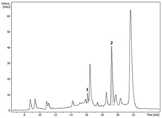 HPLC chromatogram of a chlorophyll-free residue (A’) from an EtOAc extract of dried leaves of Lepechinia mutica. Peak 1: carnosol (1); peak 2: carnosic acid (2).