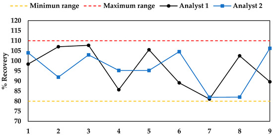 The accuracy of the developed method was evaluated by adding known amounts of standard carnosol to samples of L. mutica extract and comparing the extracted amounts to the added amounts. Each of the two analysts 1 and 2 carried out nine experiments in three consecutive days (see Section 3.8.2). The graphs of the percent carnosol recovery (% R) for the two groups of analyses (Figure 5) showed a normal distribution of values, ranging from 81% to 108%, with a mean value of 96% over the entire range. These values were within the range acceptable by the AOAC validation guidelines [29], indicating that the method was deemed precise and accurate.