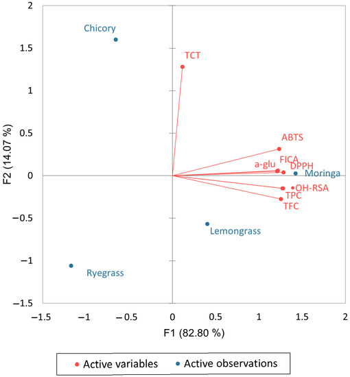 Flavonoids showed significant hydroxyl inhibition, free radical scavenging, and ferric ion chelation activity correlations. This further demonstrates the variety of phenolic and nonphenolic metabolites found in plant extracts. This may be related to the fact that a flavonoid’s capacity to act as an antioxidant is affected by the location of the hydroxyl group on the B-ring and whether it can deliver a free radical, either a hydrogen atom or an electron, or both. A biplot analysis (Figure 1) was conducted to investigate the correlation between active variables (TPC, TFC, TCT, DPPH, ABTS, FICA, •OH-RSA, and alpha-glucosidase inhibition activity) and active observations (lemongrass, chicory, ryegrass, and moringa).