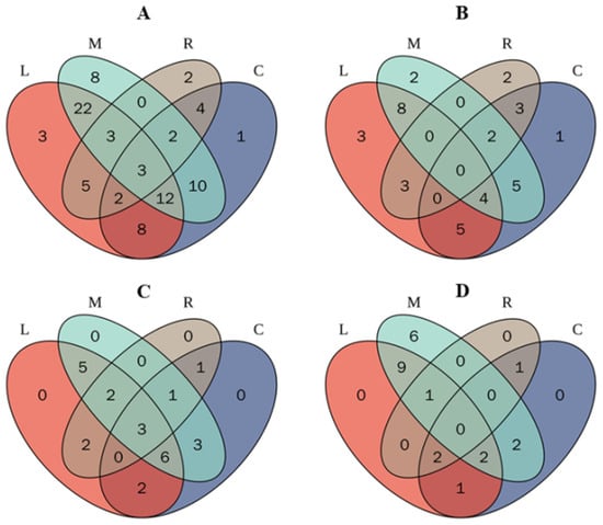 Distribution of phenolic compounds (Venn diagram) in lemongrass (L), moringa (M), ryegrass (R), and chicory (C): total phenolic (A), flavonoids (B), phenolic acids (C), and other compounds (D).