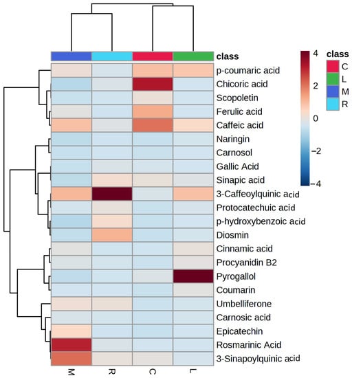 Table S1 lists the twenty-two quantified compounds that were measured in the lemongrass, moringa, ryegrass, and chicory plants. The most common type of compound in these plants is flavonoids. Moringa had the highest concentration of hydroxycinnamic acids, with rosmarinic acid having the highest concentration (748.32 ± 25.82 μg/g) 3-caffeoylquinic acid (103.93 ± 12.51 μg/g), 3-sinapoylquinic acid (125.23 ± 19.42 μg/g), and caffeine (264.05 ± 11.54 μg/g). Cinnamic acid was present in only three samples, lemongrass, chicory, and moringa (91.38 ± 8.87, 17.71 ± 1.18, and 31.32 ± 5.06, respectively). The lowest chlorogenic acid content was measured in moringa, whereas chlorogenic acid (3-caffeoylquinic acid) is the most prevalent phenolic acid in ryegrass (445.62± 31.52 μg/g). It was previously measured [36] to determine the amount of chlorogenic acid in nonconventional plants. Only chicory (286.12 ± 31.27 μg/g) and ryegrass (15.82 ± 1.59 μg/g) contain chicoric acid; p-hydroxybenzoic acid was measured in lemongrass (36.13 ± 0.73 g/g) and ryegrass (75.92 ± 5.67 μg/g). Lemongrass had the highest content of caffeic acid (366.78 ± 14.77 μg/g), and chicory plant extract had the lowest concentration (245.67 ± 21.55 g/g). Ryegrass plants also contained protocatechuic acid (63.14 ± 3.58 μg/g) and sinapic acid (51.05 ± 5.12 μg/g). Chicory contained gallic acid (23.59 ± 2.04 μg/g) and p-coumaric acid (154.90 ± 12.62 μg/g). Additionally, procyanidin B2 was detected to be highest in moringa (68.76 ± 4.12 μg/g) and lowest in lemongrass (44.62 ± 6.32 μg/g). Ryegrass had the highest content of diosmin (132.63 ± 11.06 μg/g), whereas moringa had the lowest value (9.51 ± 1.43 μg/g). Additionally, MetaboAnalyst 5.0 (www.metaboanalyst.ca accessed on 22 March 2023) was used to perform hierarchical heatmap clustering (Figure 3).