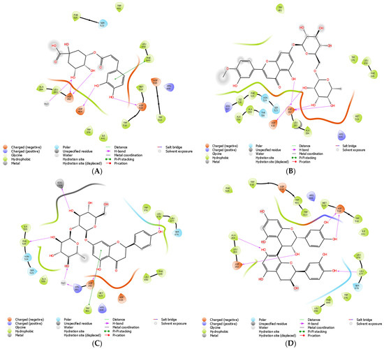 Two-dimensional binding geometry of chlorogenic acid (A), diosmin (B), naringin (C), and procyanidin B2 (D).