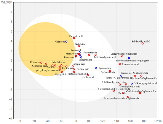 The BOILED-Egg method for monitoring phenolic chemicals, which are widely present. The red dots denote molecules that are not expected to be expelled by P-glycoprotein from the CNS, whereas the blue dots denote compounds expected to be expelled from the CNS.