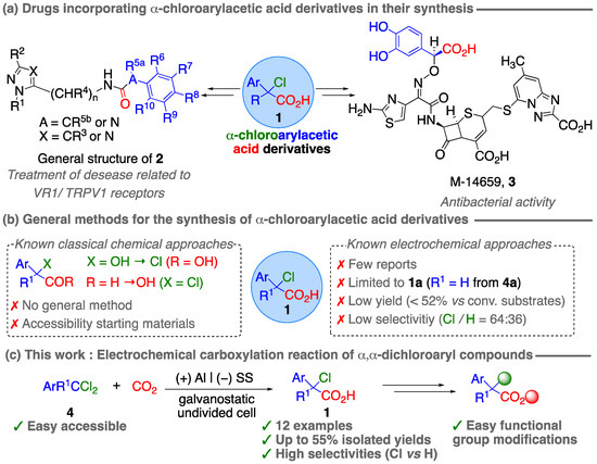 α-chlorophenylacetic acid derivatives 1 are versatile synthetic intermediates involved in the synthesis of several drugs such as (1) amides or thioureas derivatives 2 used in the treatment of diseases that are at least partially mediated by vanilloid receptors 1 (VR1/TRPV1 receptors) [1] or (2) M-14659 3, cephalosporin, obtained by semi-synthesis, exhibiting a broad spectrum of antibacterial activity (Scheme 1a) [2]. Therefore, several chemical methods were reported to have access to α-chlorophenylacetic acids (mainly oxidation of α-chloroaryl acetaldehydes [3] or chlorination of α-hydroxyarylacetic acid [4]) but none of them proved to be general (Scheme 1b). As far as electrochemical approaches are concerned, the electrocarboxylation reaction of α-chlorobenzyl derivatives has been extensively studied [5,6,7,8,9,10,11]. Contrariwise, the electrocarboxylation of α,α-dihalobenzyl species [12] and, more particularly, α,α-dichlorobenzyl species remains more elusive. To the best of our knowledge, only two articles from the group of Silvestri (one original article and a review) deal with the electrocarboxylation reaction of α,α-dichloroarylmethane derivatives 4 [13,14]. In addition to being limited to only one example (α-chlorophenylacetic acid 1a from α,α-dichlorophenylmethane 4a), the experimental conditions and the electrochemical set-up are not properly described (diaphragmless cell, Al anode, Zn cathode, DMF, n-Bu4NBr (0.1 M), 100 A.m−2, 1.87 F.mol−1), no isolated yield (52% vs. converted substrate) was given for 1a and no spectral data were provided. Moreover, the reaction proceeded with a poor selectivity (s), thus affording a 64/36 mixture of α-chlorophenylacetic 1a acid and phenylacetic acid 5a. Therefore, the selective reduction in one of the two benzylic geminal chlorine atoms remains a challenging task. Since the publication of these articles, electrosynthesis has undergone a rebirth, mainly during the last ten years, providing easily accessible and reproducible conditions for synthetic chemists [15,16,17,18,19,20]. We thus would like to report our contribution to the electrocarboxylation reaction of α,α-dichloroarylmethane 4 derivatives in order to provide an efficient and selective synthesis of α-chloroarylacetic acid derivatives 1 (Scheme 1c).