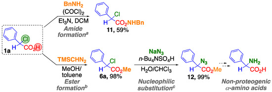 First, the acid moiety was submitted to an amidation reaction via the corresponding acid chloride in the presence of benzyl amide, affording the amide derivatives 11 in 59%. An esterification was also possible by using trimethylsilyldazomethane in a mixture of toluene and methanol to give the chlorinated ester 6a in almost quantitative yields. More interestingly, the chlorine atom of 6a can be submitted to nucleophilic substitution in the presence of sodium azide under liquid/liquid phase-transfer conditions, leading to 12 in an excellent yield. The product 12 is of particular interest as it paves the way to the access of non-proteogenic α-amino acid derivatives [26,27].