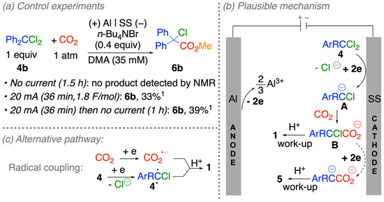 According to previous reports [13,14] and our own study (see Supplementary Materials for CV experiments) ((a) The reduction potential of PhCHCl2 in DMA (Ered = −2.2 V/SCE) was found to be similar to previously reported value in DMF, see ref [28] and supporting information. (b) Our attempts to determine the reduction potential of CO2 in DMA failed (see supporting information). (c) Our attempts to clarify the exact role of the Al3+ by CV have not been conclusive (see Supporting Information)), we have proposed a plausible mechanism (Scheme 4b). First, the α,α-dichloroarylmethane derivatives PhRCCl2 4 would be reduced at the cathode (Ered = −2.2 V/SCE for R = H and Ered = −1.8 V/SCE for R = Ph in DMF) [28] thanks to a two electron process to provide the corresponding α-chloro anion A which then would add to CO2 (Ered = −2.2 V/SCE in DMF) [29] to give the α-chlorophenylacetic carboxylate B flanked by an aluminum counter-ion. Simultaneously, the aluminum anode plate would be oxidized to afford the corresponding aluminum (III) cation in solution. This aluminum counter-ion is expected to stabilize the carboxylate anion generated during the electrolysis which is generally unstable under the electrochemical conditions [7] and also to avoid its possible transformation into mandelic acid [13]. Finally, the expected product 1 would be obtained after aqueous work-up. The by-product 5 could be obtained by the further reduction in B at the cathode followed by aqueous work-up. Nevertheless, due the close proximity between the reduction potential of CO2 and that of some of the α,α-dichloroarylmethane derivatives 4, a mechanism first involving the reduction in CO2 to form the corresponding radical anion followed by the radical coupling with 4 (resulting from the one electron reduction in 4 at the cathode) cannot totally be ruled out (Scheme 4c).
