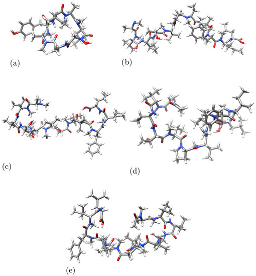 As outlined in Section 3, we acquired the molecular configurations of the optimized variations of Talarolide A and Talaropeptides A–D sequences. This accomplishment was facilitated by the utilization of the Density Functional Tight-Binding Approximation (DFTBA) model available within Gaussian 16. An initial reoptimization was carried out in the gaseous phase. Subsequently, another reoptimization was conducted through the implementation of the MN12SX density functional, using the Def2SVP basis set and the SMD solvent model with water as the solvent. To ensure congruence with the lowest energy conformations, the frequency-calculation analysis technique was employed for structural validation. However, this time we employed the Def2TZVP basis set instead of the one employed in the initial geometry optimization. The choice of the MN12SX density functional and the Def2SVP basis set for the geometry optimization and the Def2TZVP basis set for the calculation of the Conceptual DFT descriptors is justified on the knowledge acquired through previous published research where it has been shown that these model chemistries are the most adequate on each case for the computational determinations when molecules and peptides of the size of those studied here are considered [17,18,19]. The optimized molecular structures of the studied peptides are displayed in Figure 2.