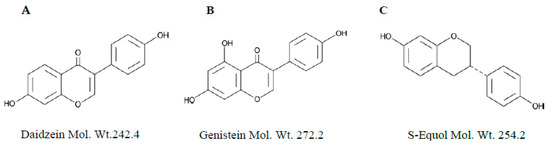 Chemical structures of Daidzein (A), Genistein (B), and S-Equol (C).