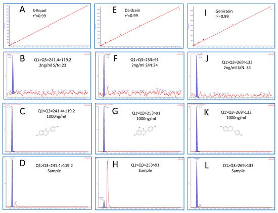 Linear calibration curve (A,E,I), multiple reaction monitoring (MRM) chromatograms for LOD (B,F,J), high-quality control (HQC) chromatogram ((C,G,K) and in vivo mice urine sample (D,H,L)) for S-Equol, Daidzein, and Genistein, respectively.