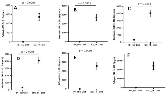 (A,B) Diadzein, (C,D) Genistein, and (E,F) S-Equol quantitation using the rapid LC-MS/MS method in urine samples on phyto-Free (PF) and isoflavone-rich (ISO) diet. Data are expressed as mean ± SD (n = 12). Two-tailed unpaired t-test. p < 0.0001. PF, phyto-Free; ISO, isoflavone-rich.