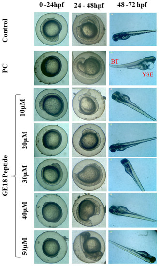 Developmental toxicity on zebrafish larvae’s 0 hpf to 72 hpf. The larva was treated with five different peptide concentrations, control (untreated group) and positive control (PC), which were 1 mM H2O2. PC showed abnormal morphologies such as yolk sac edema (YSE) and bent tail (BT).