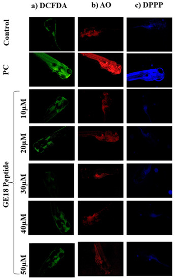 Fluorescent imaging assay on 96 hpf zebrafish larvae treated with GE18 peptide. Untreated was a control group, and positive control (PC) was treated with 1 mM of H2O2. (a) Intercellular ROS measurement by DCFDA, (b) apoptosis detected by acridine orange and (c) measurement of lipid peroxidation by 1,3-Bis(diphenylphosphino)propane (DPPP).
