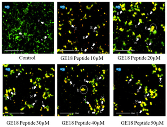 Photomicrographic representation of apoptotic stages by AO and EtBr staining on MCF-7 cells. Control (untreated) and GE18 peptide-treated cells. The stages were mentioned as V—viable cells; E—early apoptotic cells; L—late apoptotic cells; and N—necrotic cells. The white arrow indicates the apoptotic stages of cells.