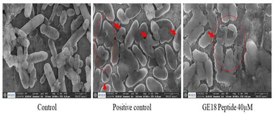 The effect of peptide on bringing out changes on the membrane surface and morphological changes was analyzed by the FE-SEM analysis. GE18 at 40 µM on P. aeruginosa significantly affected the cellular morphology, where shrinkage of the cell membrane and damaged cells were identified. The observed results were compared with the positive control (1 mg/mL gentamicin) and untreated control (Figure 8).