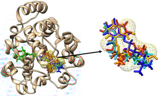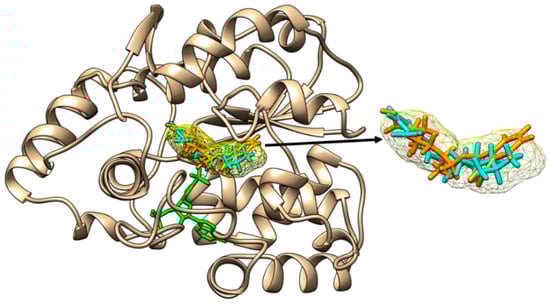 Binding of mono-carboxy-isononyl phthalate (orange sticks), of mono-hidroxy-isononyl phthalate (cyan sticks), of mono-isononyl phthalate (blue sticks) and of mono-oxo-isononyl phthalate (red sticks) to the active site of SULT1A1E1. All the binding poses correspond to the binding position of 3,3′,5,5′-tetrachloro-4,4′-biphenyldiol (yellow mesh surface). The inactive cofactor adenosine-3′-5′-diphosphate is revealed in green sticks.