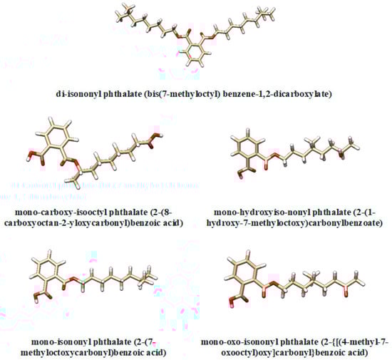 Three-dimensional structures of the di-isononyl phthalate and of its metabolites. The atoms are coloured like this: carbon—brown, oxygen—red, hydrogen—white.