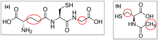 The molecular structure of L-glutathione (GSH) (a) and N-acetyl-L-cysteine (NAC) (b) with hydrophobic moieties highlighted in red. Note that the hydrophobic acetyl-moiety in NAC makes this thiol comparatively more hydrophobic as it is terminal, whereas the hydrophobic moieties in GSH are buried in its structure.