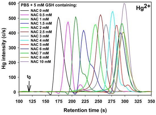 Representative Hg-specific chromatograms obtained after the injection of Hg2+ on a Gemini C18 RP-HPLC column (150 × 4.6 mm I.D.) at 37 °C using 5.0 mM GSH with 0–10 mM NAC in PBS buffer (pH 7.4). Flow rate: 1.0 mL/min. Detector: ICP-AES (Hg at 253.65 nm). Injection volume: 20 µL (5 μg Hg).