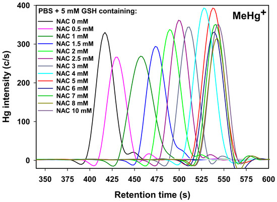 Representative Hg-specific chromatograms obtained after the injection of MeHg+ on a Gemini C18 RP-HPLC column (150 × 4.6 mm I.D.) at 37 °C using 5.0 mM GSH with 0–10 mM NAC in PBS buffer (pH 7.4). Flow rate: 1.0 mL/min. Detector: ICP-AES (Hg at 253.65 nm). Injection volume: 20 µL (5 μg Hg).