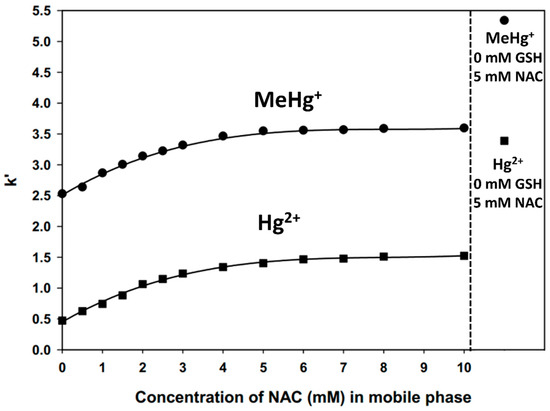 The biochemical mechanisms that determine the fate of Hg2+ and MeHg+ after they enter mammalian cells are incompletely understood [33,34], and very little is known about the mechanisms that are involved in their urinary excretion [10]. Therefore, research focused on the bioinorganic processes governing their intracellular trafficking holds considerable toxicological importance [35]. To this end, PBS buffer mobile phases, which contained 5.0 mM GSH and increasing NAC concentrations (0.5–10.0 mM), were used to systematically investigate the retention behavior of Hg2+ and MeHg+ on a C18 RP-HPLC column. The obtained Hg-specific chromatograms are depicted in Figure 2 and Figure 3. To better visualize the differences in the retention behavior of these mercurials, the retention factors (k′-values) that were obtained for the main Hg-peak of each mercurial were plotted as a function of the NAC concentration in the mobile phase (Figure 4).