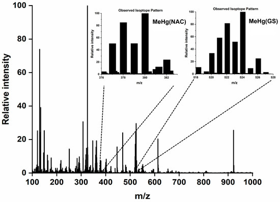 ESI-MS identification of the CH3Hg+ complexes CH3Hg(NAC) and CH3Hg(GS) after RP-HPLC-ICP-AES analysis using 50 mM Tris buffer (pH 7.4, 5.0 mM GSH, 5.0 mM NAC) as the mobile phase.