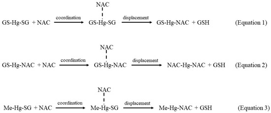 Illustration of the proposed reactions of Hg2+ and MeHg+ with GSH and NAC in the mobile phase that can help to explain their retention behavior observed by SEC-ICP-AES.