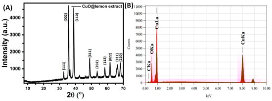 (A) XRD spectra of CuO@lemon extract and (B) EDX spectrum for CuO@lemon extract.