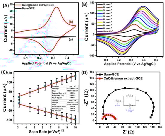 (A) CV study for (b) CuO@lemon-extract GCE at 10 to 100 mVs−1 in the presence of a 1.0 mM K3Fe(CN)6 probe in a 0.1 M KCl electrolyte, ((a) Bare-GCE) (B) CuO@lemon-extract GCE at different scan rates, (C) plot of peak current vs. square root of scan rate, and (D) Nyquist plot of CuO@lemon-extract GCE at frequency range of 0.1 Hz to 106 Hz in the presence of a 1.0 mM K3Fe(CN)6 probe in a 0.1 M KCl electrolyte.