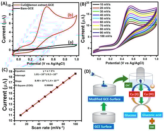(A) CV record of (a) bare GCE and (b) CuO@lemon-extract GCE in presence of 0.1 mM glucose with 0.1 M NaOH at the various electrodes (scan rate, 10 mVs−1); (B) with the same solution of glucose CV recorded of CuO@lemon-extract GCE in 0.1 mM glucose at various scan rates (10–100 mVs−1); (C) calibration between current vs. the different scan rate plot; and (D) possible illustration of glucose to gluconic acid.