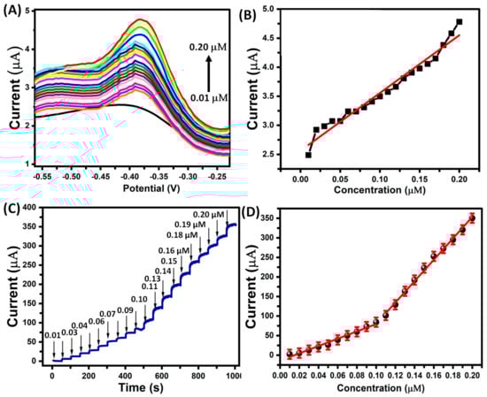 (A) DPV response of CuO@lemon-extract GCE towards 0.01 μM to 0.20 μM glucose with 0.1 M NaOH. (B) The calibration plot of current intensity vs. concentration (μM). (C) Amperometry response of CuO@lemon-extract GCE towards 0.01 µM and 0.2 µM glucose with 0.1 M NaOH. (D) The calibration plot of current intensity vs. concentration (μM).