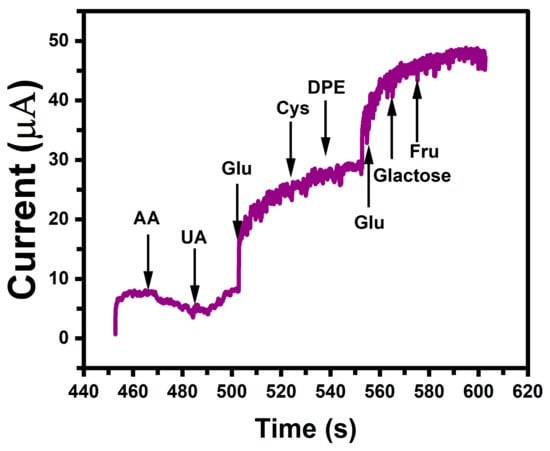 The presence of multiple substances, such as ascorbic acid (AA), uric acid (UA), dopamine (DPE), cysteine (Cys), and other carbohydrates like fructose (Fru) or galactose, might possibly impact the detection selectivity for determining glucose, especially at higher levels of glucose. As shown in Figure 6A, the response of the glucose (Glu) current is unaltered even when exposed to 10-times higher amounts of AA, UA, Cys, and DPE. This underscores the exceptional sensor selectivity.