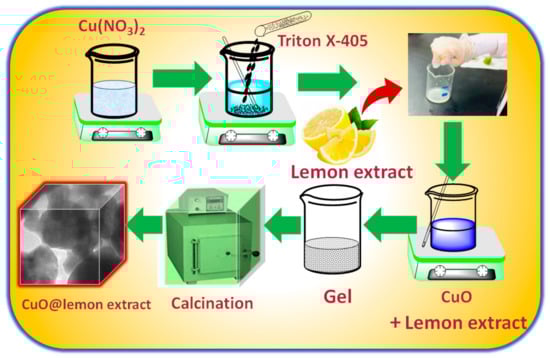 The CuO@lemon extract was synthesized by dissolving 2 g of Cu(NO3)2 (50 wt% from BDH-MERCK) in 2 g of high-purity water (50 wt%). A quantity of 4 g of triton X 405 (Sigma-Alrich-MilliporeSigma, Burlington, MA, USA, 70% wt%) was progressively added to this solution. The lemon extract utilized in our study was obtained from ripe Eureka lemons, which were procured from a local organic supplier. Lemon peels were thoroughly washed and subjected to a cold-pressing extraction method in which mechanical pressure was applied to release the essential-oil content from the peels. No pre-treatment steps were employed. This information has been incorporated to enhance the transparency of our methodology, ensuring that readers and researchers have a comprehensive understanding of our lemon-extract preparation procedure. A rich blue gel was produced after adding 4 mL fresh lemon extract and stirring the mixture for 30 min. The gel underwent a 5 h calcination treatment at 500 °C in a furnace with cooling and heating rates of 4.17 °C/min before it reached ambient temperature after being held at ambient temperature for 120 h. The defined CuO@lemon-extract nanoporous materials were submitted to a variety of analytical procedures before being used in glucose sensing (Scheme 1).
