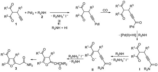 Mechanistic route leading to 2-(4-acylfuran-2-yl)acetamides 3 by PdI2/KI-catalyzed oxidative aminocarbonylation of 2-propargyl-1,3-dicarbonyl compounds 1 with secondary amines 2 through the formation of 2-ynamide intermediates I and II.