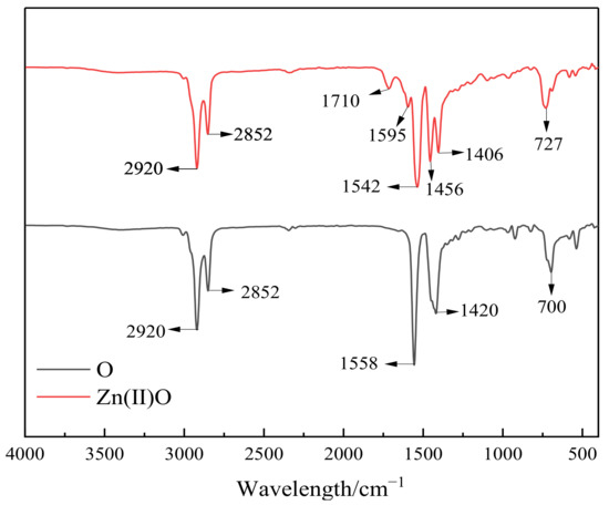 As shown in Figure 1, the oil-soluble catalyst Zn(II)O was analyzed by infrared spectroscopy. From Figure 1, it can be seen that there are two strong absorption peaks at 2800–2950 cm−1, which are the stretching vibration peaks of the C-H bond in methyl and methylene groups. The carboxyl groups of metal carboxylates have characteristic absorption peaks in two regions, with the absorption peak between 1610 and 1540 cm−1 being an anti-symmetric stretching vibration peak and the absorption peak between 1464 and 1362 cm−1 being a symmetric stretching vibration peak. Generally, the absorption peak intensity of the latter is weaker than that of the former [16]. The absorption peak at 1710 cm−1 is the stretching vibration peak of the C=O bond. Due to the inhibition of the conjugated structure of carboxylates by the ligand complexing with zinc ions, it is believed that the catalyst Zn(II)O has been generated.