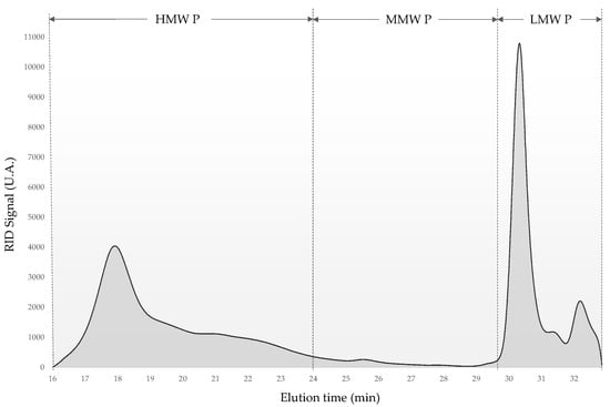 The molecular weight distributions of the polysaccharides evaluated in the extracts obtained from grape pomace were determined with High-Performance Size-Exclusion Chromatography with a Refractive Index Detector (HPSEC-RID) using an Agilent Technologies 1200 Chromatograph (Santa Clara, CA, United States, 2009) following the chromatographic conditions described in Guadalupe et al. [46]. Two Shodex chromatographic columns, OHpak SB-803 HQ and OHpak SB-804 HQ (300 mm × 8 mm i.d.) with a precolumn Shodex OHpak SB-G 6B (50 mm × 6 mm i.d.). Calibration was performed with narrow dextran molecular weight standards from 410 to 5 kDa. The three different fractions were estimated to their molecular weight: high molecular weight polysaccharides (HMW P, between 700 and 100 kDa), medium molecular weight polysaccharides (MMW P, between 100 and 5 kDa) and low molecular weight polysaccharides (LMW P, <5 kDa).