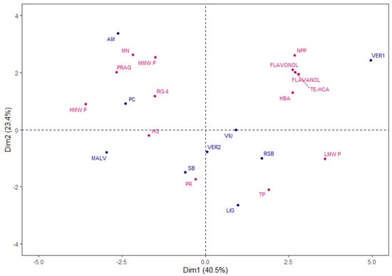 The VER1 extract, sited in the positive side of Dim 1 and 2, was clearly separated from the other extracts and was positively correlated with the HBA, HCA, Flavanols and Flavonols, as well as NPP and LMW P. On the other hand, the AM and PC extracts were located on the left side of the plane, correlating mainly with the remaining polysaccharide families, MN, PRAG, RG-II and HG, which correspond to the pectic polysaccharides. Finally, the remaining varietal extracts were located in the lower part of the plane and were more correlated with the PR and TP content.