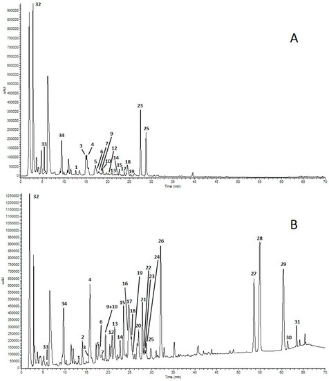 HPLC-UV and HPLC-ESI-ITMS analysis allowed the identification of phenolic compounds and capsaicinoids in pepper fruit extracts. HPLC-UV chromatograms of GP and RP3 samples are shown in Figure 1A,B.